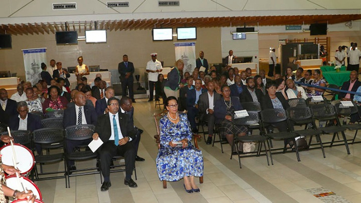 NASSAU, The Bahamas -- The Governor General Her Excellency Dame Marguerite Pindling attended the official Unveiling of Series 2017 CRISP Evolution One Dollar Banknote in the Gardens of LPIA, September 27, 2017. The Governor General holds a commemorative issue of the banknote, in the photograph, along with Governor of the Central Bank John Rolle. In the audience was Deputy Prime Minister and Minister of Finance the Hon. Peter Turnquest, seated front, left. (BIS Photos/Raymond A. Bethel, Sr.)